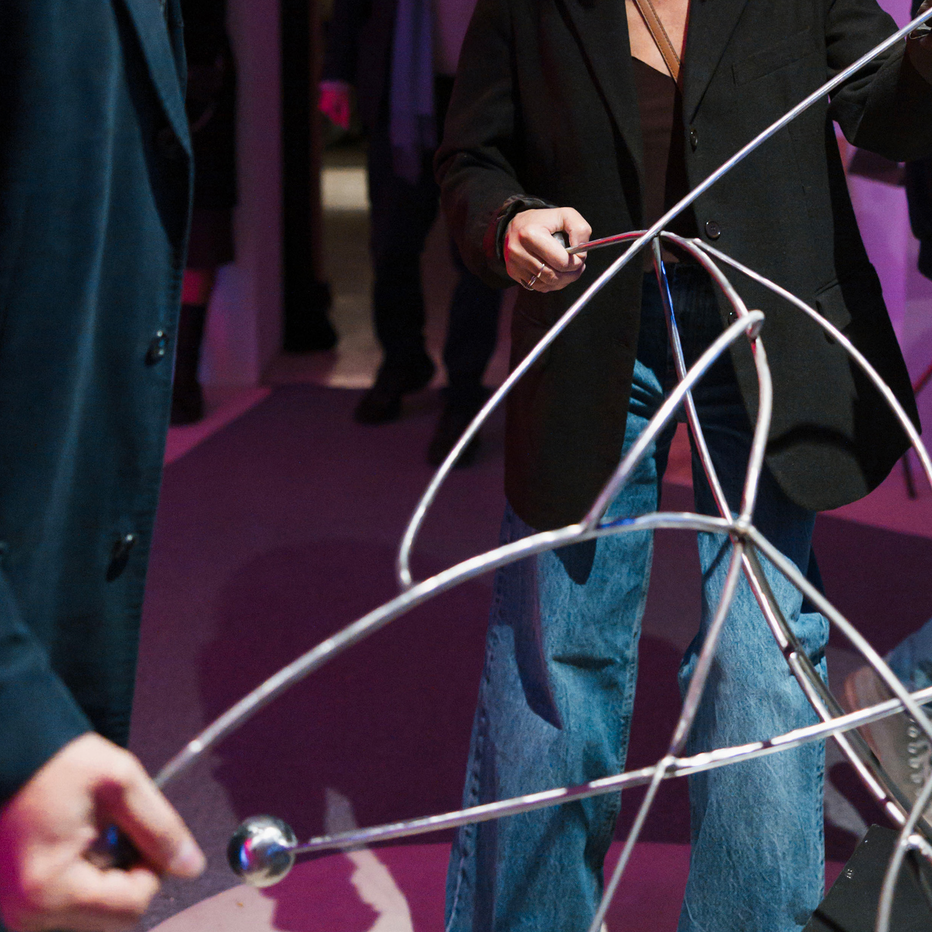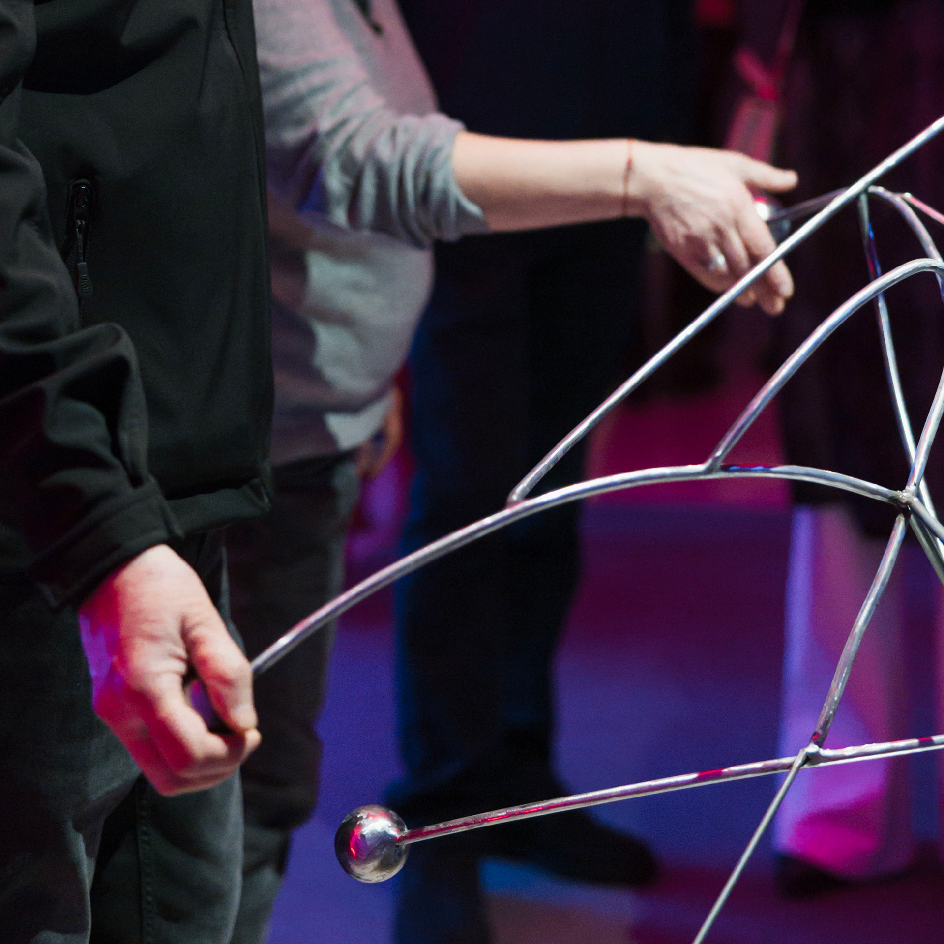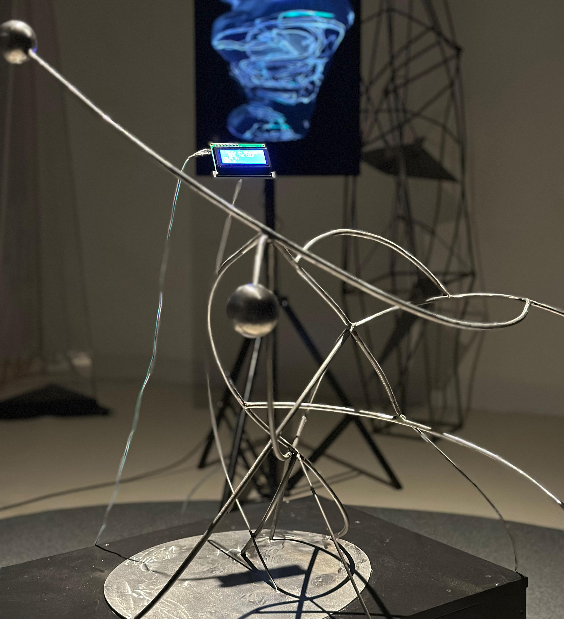The interactive component was developed in collaboration with metal artist Ditjan Muça, whose sculpture acts as a bridge between the public and the installation. Ditjan believes metal is alive — though it may seem stiff, it constantly vibrates and holds energy.